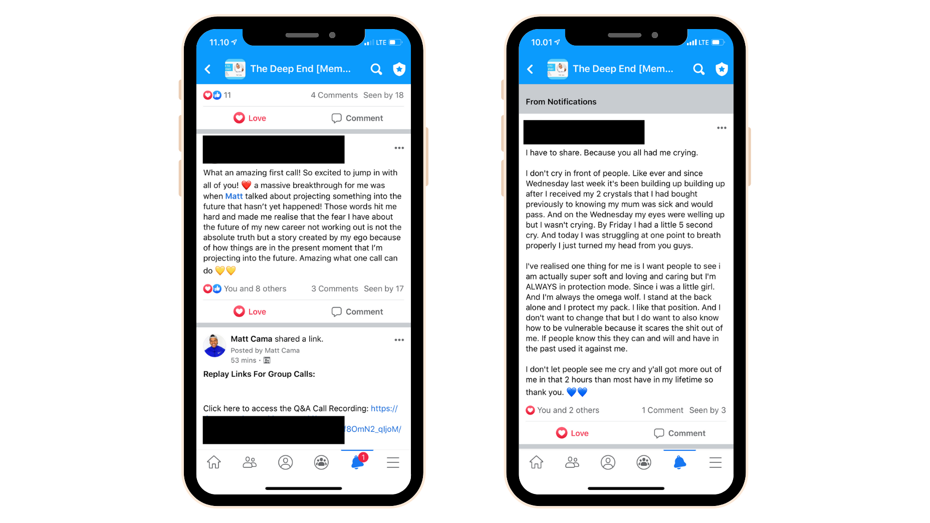 Here are screenshots of what members have messaged me or have posted inside the Deep End private Facebook group.